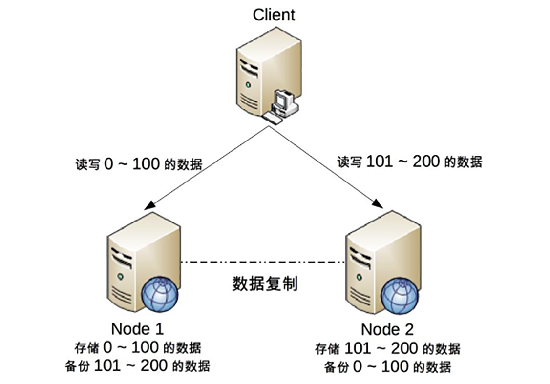 可以将用户id为0 ~ 100的数据存储在Node 1,将用户id为101 ~ 200的数据存储在Node 2,Client根据用户id来决定访问哪个Node。对于单个用户来说,读写操作都只能在某个节点上进行;对所有用户来说,有一部分用户的读写操作在Node 1上,有一部分用户的读写操作在Node 2上。
