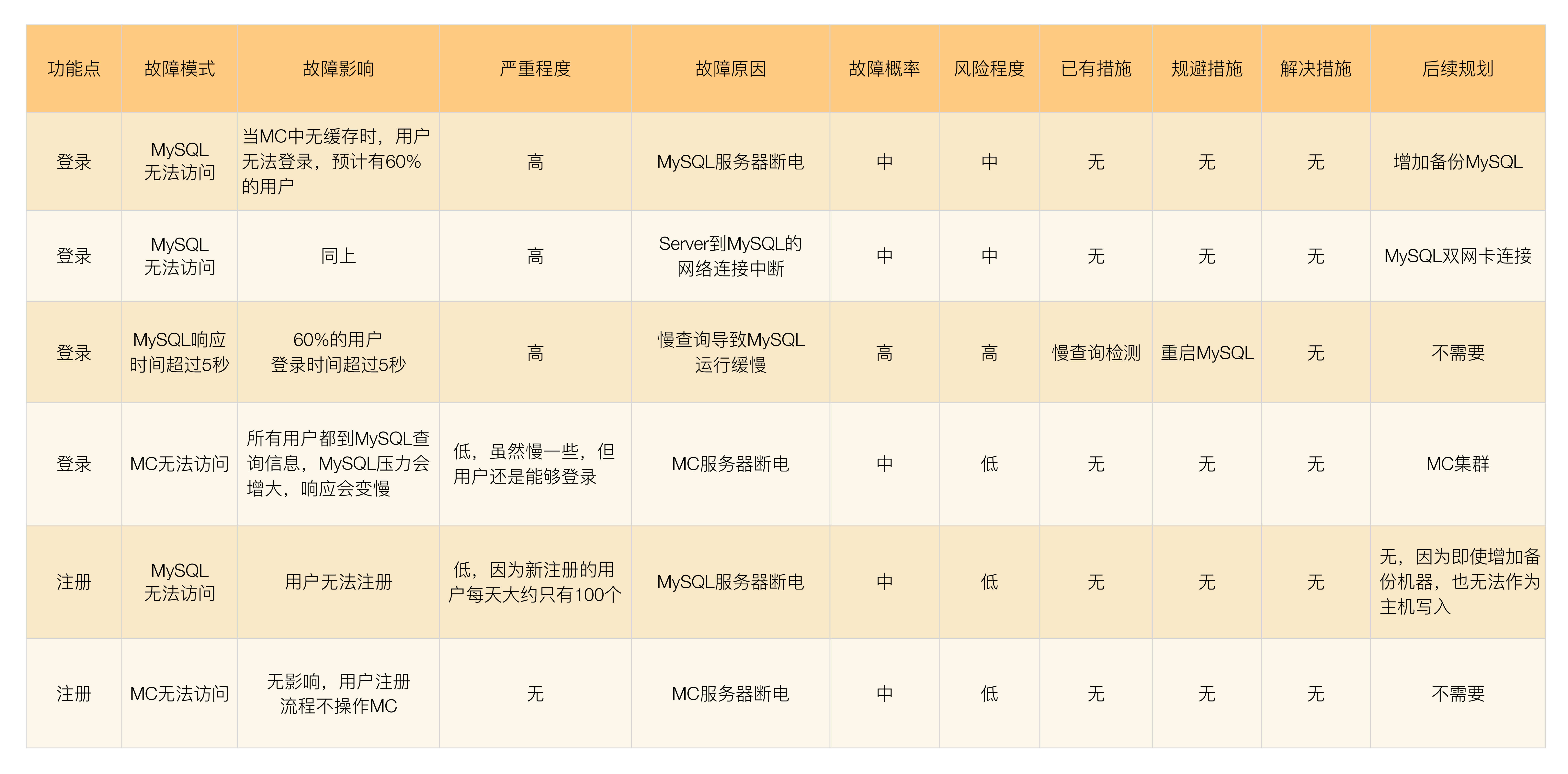 初始架构很简单:MySQL负责存储,Memcache(以下简称MC)负责缓存,Server负责业务处理。我们来看看这个架构通过FMEA分析后,能够有什么样的发现,下表是分析的样例